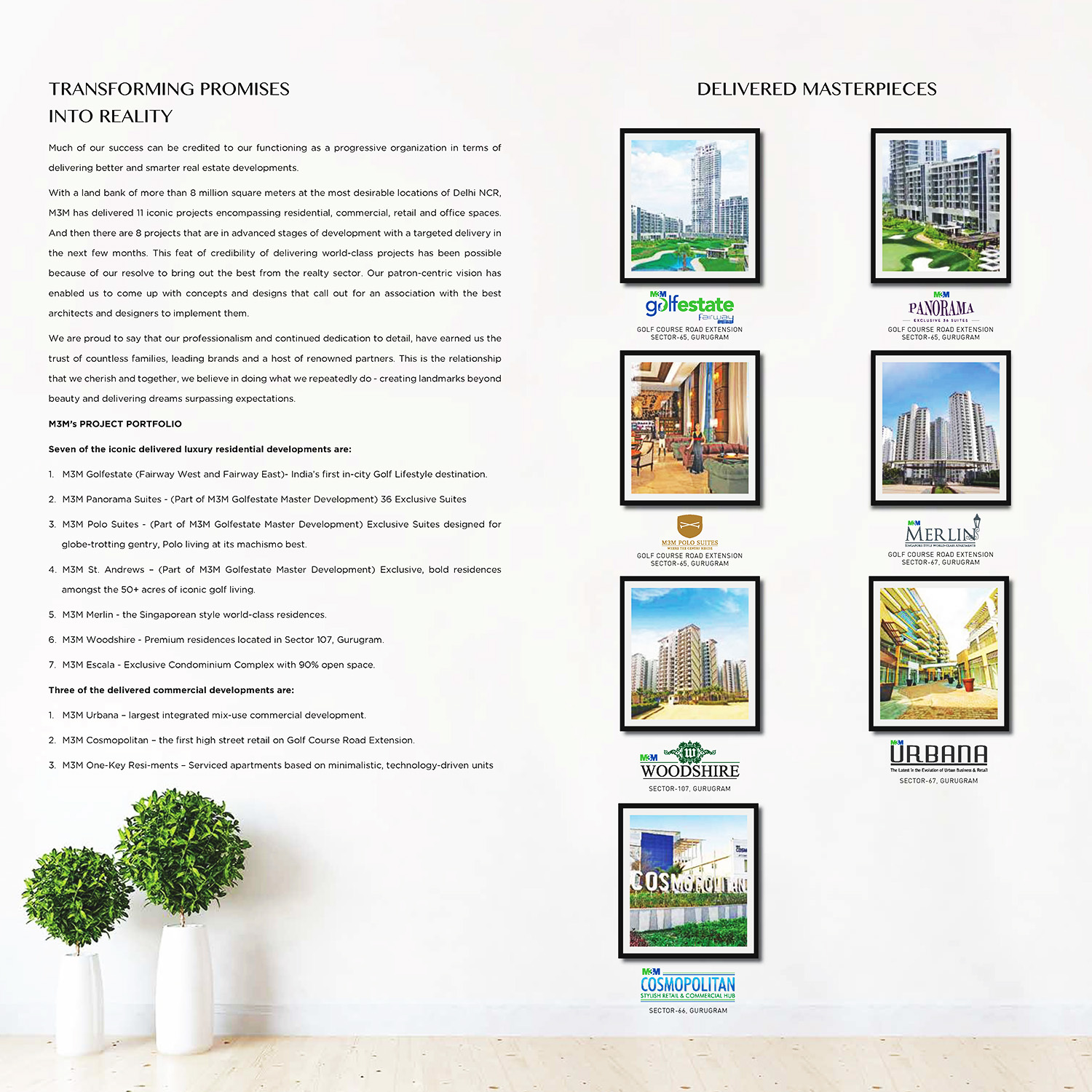 Disclaimer:- Welcome to M3M Avenue (“Website”). The contents of this website are for general informational purposes only. By using or accessing this Website and/or the hyperlinks embedded/ mentioned in the Website you agree to abide by the terms and conditions, as set forth herein and as contained in the Website without any qualification or limitation. In the event you do not accept/ agree to the terms of this Disclaimer, you are requested not to use the Website or download materials from the Website. Every endeavor has been made to keep the information updated. However, we make no representations or warranties of any kind, express or implied, about the completeness, accuracy, reliability, suitability or availability with respect to the Website or the information, products, services, or related graphics contained in the Website for any purpose. The Website and all its content are provided on an “as is” and “as available” basis and is intended for informational purposes only. No information given under this Website shall be treated as a warranty or representation by us. Your use of the Website is solely at your own risk. This Website is for guidance only. It does not constitute part of an offer or contract. The contents, including design and specifications are subject to change without prior notice. Computer generated images are the artist’s impression and are an indicative of the actual designs. By using and/or accessing this Website, you, the viewer/user acknowledge that the information including any material/ documents (such as brochures and marketing collaterals) on this Website are solely for informational purposes and you have not relied on this information for making any booking/ purchase/ intention to purchase/ invest in any project(s) of M3M Avenue and/or its affiliates. Nothing herein shall be construed as any invitation, or offer for investment or deposit within the terms of the applicable law (as amended from time to time) including without limitation SEBI Act, 1992, Companies Act 2013 etc. and we shall not be liable for any consequence of any action taken by the viewer relying on such material/ information on this Website. The particulars contained on the Website mention details of Projects/ developments undertaken by M3M Avenue and/or its affiliates. The contents are being modified in terms of the stipulations/ recommendations under the Real Estate Regulation Act, 2016 and Rules made thereunder (“RERA”) and accordingly may not be fully in line thereof as of date. Use of information shall be governed by Indian laws, RERA; subject to jurisdiction of Competent Authority under RERA, courts at Gurugram/ Haryana India. You are further advised to verify all the details, including area, amenities, services, terms of sales and payments and other relevant terms independently with the sales team independently, subject to prior appointment during working hours and speak to one of our sales staff, prior to concluding any decision for buying any unit(s) in the said project. In no event shall M3M Avenue, its affiliates, employees, directors and/or officers be made liable for any claim as a result of any inaccuracies in the information provided in this Website, though all efforts have to be made to ensure accuracy and under no circumstances shall we be liable for any expense, loss or damage including, without limitation, indirect or consequential loss or damage, or any expense, whatsoever arising from use, or loss of use, of data, arising out of or in connection with the use of this Website.